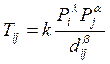 где Тij - мера притяжения объектов i и j друг к дугу; Pi и Pj – некоторая мера значимости объекта (например, численность населения города i и города j); dij – расстояние между ними; k – коэффициент соответствия, зависящий от ранга события, например, если система пространственного взаимодействия достаточно хорошо определена, то значение k буден выше при рассмотрении взаимодействий между объектами в течение года, чем значение k при рассмотрении их в течение одной недели; β – параметр, зависящий от эффективности транспортной системы между двумя объектами, например, если два объекта соединены между собой автобаном, то величина коэффициента будет ниже, чем при их взаимодействии по обычной дороге; λ – потенциал генерации потоков. Для перемещений людей коэффициент часто зависит от суммарного уровня социального обеспечения. Например, вполне логично, что для потоков розничных товаров место, где население имеет большие доходы создает большие потоки.; α – потенциал привлечения потоков. Зависит от вида экономической деятельности в пункте назначения. Например, центральное мест, где размещаются важные коммерческие виды деятельности, будет притягивать потоки. Адекватность гравитационных моделей, экономическая обоснованность их применения оспаривается рядом специалистов. А. Шеффле, используя гравитационную модель, утверждал, что промышленность развивается преимущественно в больших городах или поблизости от них. Большие города притягивают к себе промышленные предприятия, причем сила их притяжения обратно пропорциональна квадрату расстояния между ними: