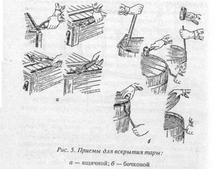 на быть принята с соответствующими нормативными документами и условиями договора поставки материально-ответственными лицами так же, как и товар. Приемка по количеству включает проверку фактического наличия тары и сопоставление его с данными сопроводительных документов. При приемке тары необходимо обратить внимание на наличие сертификата, а также правильность тарной маркировки, соответствие ее требованиям ГОСТов. При приемке тары по качеству проверяют ее целостность, внешний вид, обращают внимание на дефекты: наличие повреждений, загрязнений и т. д. Выявляют, насколько качество поступившей тары соответствует требованиям ГОСТов, технических условий и данным сопроводительных документов. При обнаружении несоответствия качества тары требованиям стандартов следует приостановить приемку и составить акт в том же порядке, что и на товар. Если фактическое количество, качество, цены и маркировка поступившей тары соответствуют данным сопроводительных документов (товарно-транспортная накладная, счет-фактура), то материально-ответственное лицо расписывается на них в получении и ставится штамп приемки, и тара оприходуется. Вскрытие тары должно производиться специальными инструментами с тем, чтобы сохранить ее качество (рис. 4). Приемы правильного вскрытия ящичной и бочковой тары показаны на рис. 5. Мешки вскрывают специальными серпообразными ножами с утолщениями на конце, тщательно оберегая ткань от порезов. После освобождения бочек от товара донья укладывают на