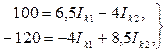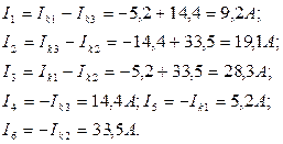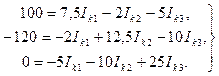 3. Решая совместно уравнения (5), (6), (7), определяем контурные токи. В том случае, когда контурный ток получается со знаком “минус”, это означает, что его направление противоположно выбранному на схеме. 4. Токи во внутренних ветвях схемы определяются как сумма или разность соответствующих контурных токов. В том случае, когда контурные токи в ветви совпадают, берут сумму, а когда направлены навстречу − токи вычитают. 5. Токи во внешних ветвях схемы равны по величине соответствующим контурным токам. Пример. Рассчитать сложную цепь постоянного тока для схемы, изображенной на рис. 4. Задано: Е1 = 100 В, Е2 = 120 В, r01 = r02 = 0,5 Ом, r1 = 5 Ом, r2 = 10 Ом, r3 = 2 Ом, r4 = 10 Ом. Определить токи в ветвях цепи. Решение. Используя уравнения (5), (6) и (7), получаем: