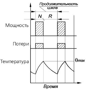 S3 - повторно - кратковременный режим последовательность идентичных циклов работы, каждый из которых включает время работы N при неизменной нагрузке, за которое машина не нагревается до установившейся температуры, и время стоянки R, за которое машина не охлаждается до температуры окружающей среды.