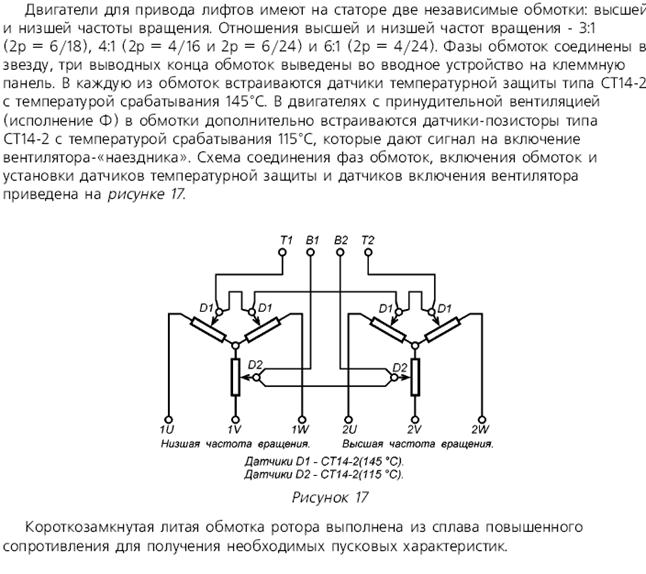Повышение вибрации сверх допустимой отрицательно сказывается на подшипниках и обмотках двигателя, увеличивает его износ и расшатывает крепления. В ряде случаев при сильной вибрации возможны задевание ротора за статор, поломка вала, обрывы в обмотках и др. Кратковременные перегрузки по току статора асинхронных двигателей мощностью более 0,6 кВт, кроме машин с непосредственным охлаждением, допускаются в пределах до 50% в течение 2 мин, а мощностью до 0,6 кВт — в течение 1 мин. Эти перегрузки допускаются при работе двигателей в нагретом состоянии. Асинхронные короткозамкнутые двигатели с непосредственным охлаждением обмоток допускают перегрузку по току на 50% в течение 1 мин. Указанные перегрузки по току двигатели должны выдерживать без остаточных деформаций и повреждений, включая распайку соединений обмоток статора и ротора. Начальный пусковой ток асинхронного двигателя может превышать номинальный ток в 5,5—7 раз для мощностей от 0,6 до 1000 кВт. Пусковой ток возникает в обмотке статора двигателя в момент подачи на нее напряжения и практически мало снижается, пока происходит разгон до частоты вращения, равной 85—90% номинальной. При частоте вращения, близкой к номинальной, величина тока снижается до номинальной, а при неполной нагрузке на валу — меньше номинальной. Наиболее быстро, за время примерно 2—4 с, запускаются насосы, кроме мощных питательных насосов, время разбега которых составляет 7—8 с. Механизмы с большими маховыми массами (дымососы, дробилки и др.) запускаются за время примерно 15—20 с. Минимальный вращающий момент в процессе пуска имеет важное значение, так как от его величины зависит возможность запуска двигателя, особенно при больших начальных моментах сопротивления на валу. Минимальный момент вращения, развиваемый в процессе разгона трехфазными асинхронными двигателями 0,1 —100 кВт от неподвижного состояния до частоты вращения, соответствующей номинальному моменту, при номинальном напряжении и частоте составляет 0,8—1,5 поминального. Начальный пусковой вращающий момент, развиваемый трехфазными асинхронными короткозамкнутыми двигателями в указанном диапазоне мощности при неподвижном роторе, установившемся токе, номинальном напряжении и номинальной частоте, должен быть не менее одного-двух номинальных моментов. Максимальный вращающий момент, развиваемый трехфазными асинхронными двигателями, в установившемся номинальном режиме должен быть равен 1,7—2,2 номинального для мощностей 0,6—100 кВт для короткозамкнутых двигателей защищенного или закрытого обдуваемого исполнения, а также для двигателей с фазным ротором защищенного исполнения.