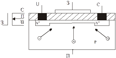 Движение носителей заряда начинается от истока в направлении стока по каналу, ширина которого зависит от напряжения, приложенного к затвору. Соответственно имеет 3 электрода: затвор, сток и исток. р-n переход является высокоомной областью неподвижных носителей заряда –ионов. Подавая на затвор запирающее напряжение (в нашем случае "-") мы увеличиваем ширину р-n переходов и соответственно уменьшаем ширину канала и увеличиваем его сопротивление.