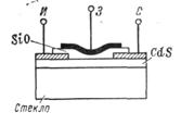 Активные элементы, работающие совместно с тонкопленочными схемами, изготавливают подобными методами. Среди транзисторов чаще других применяют полевые. Один из таких транзисторов представлен на рис.: на подложку напылена полупроводниковая пленка (CdS или CdSe), затем два металлических электрода — исток и сток. Область между этими электродами покрыта слоем диэлектрика (SiO), на который осажден слой металла, образующий затвор. Изменение напряжения затвора вызывает изменение напряженности электрического поля в слое полупроводника, а значит, и тока в цепи исток — сток. Однако свойства тонкопленочных транзисторов хуже, чем у обычных, и поэтому последние часто используют в гибридных интегральных микросхемах. В полупроводниковых интегральных микросхемах используется монокристалл кремния, в котором путем введения примесей, окисления или металлизации определенных областей, а также использования фотолитографии получают необходимые электрические параметры. Каждый элемент такой схемы образует в монокристалле своеобразный островок, изолированный от других элементов. Обеспечение хорошей изоляции отдельных элементов — одна из сложных проблем. Два противоположно направленных р-n -перехода, каждый из которых соединен с одним элементом схемы, обеспечивают довольно большое сопротивление изоляции. Другим решением, требующим, однако, овладения сложной технологией, является изоляция каждого элемента пленкой SiO2. Резисторы изготавливают следующим образом: в пластину кремния р-типа вводят путем диффузии донорные примеси, что приводит к возникновению n-области, являющейся предохранительным переходом n-p-резистора. Внутри n-области путем дальнейшей диффузии образуется область р-типа, к которой присоединяются алюминиевые выводы. Наружная пленка Si02 обеспечивает герметизацию резистора. Сопротивление у таких резисторов можно получить до 50 кОм с разбросом по номиналам ±10—20%.