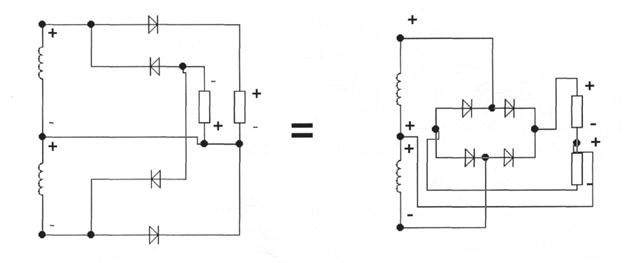 Схема выпрямления однофазного тока. Неуправляемая. Двухполупериодная со средней точкой.