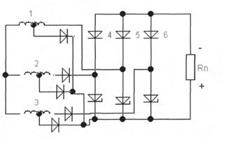 Ток будет протекать через обмотки, имеющие max и min потенциал в данный момент времени. Итоговая пульсация будет ещё меньше, а частота будет в 6 раз больше исходной. Недостатки: большое число диодов, большие потери мощности на них. Достоинства: ещё большая частота пульсации. Регулируемый трехфазный выпрямитель.