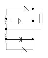 Достоинства: пониженный расход меди, отсутствие подмагничивания сердечника. Недостаток: отсутствие подмагничивания сердечника. Схема выпрямления однофазного тока. Управляемая.