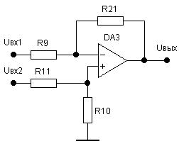 Для схемы, представленной на рисунке, выходное напряжение пропорционально разности напряжений на входах Uвх1 и Uвх2.