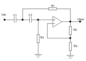 Схема может содержать резистор коэффициент передачи нерегулируемый. Часть характеристики, соответствующая фильтру пропускания нижних частот, формируется с помощью цепи