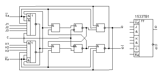 Триггер организован по принципу ведущий-ведомый и имеет по 3 входа J и K, связанных операцией &, синхронный вход С, а также асинхронные входы