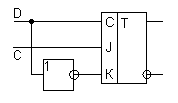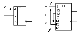 T- и TV-триггеры. T-триггер – счетный триггер, который имеет один информационный вход и меняет свое состояние всякий раз, когда меняет свое значение входной сигнал. В зависимости от того, фронт или срез используется для управления, считается, что триггер имеет прямой или инверсный вход. Единственный вид триггера, состояние которого определяется состоянием в предыдущем такте, а не от входной информации. Выполняет операцию сложения по модулю 2. Легко получается из D- или JK-триггера.