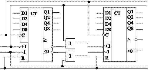 4-х разрядные быстродействующие реверсивные счетчики-делители с параллельным переносом между разрядами. По входам предварительной информации D ввод производится при низком уровне на С. Входы +1 и -1 счетные. Последовательность входных импульсов подается на один из этих входов в зависимости от того, в каком направлении (прямом / обратном) требуется вести счет. На выходе ≥15 (≥9) появляется импульс при выходной комбинации «1111» («1001»). На выходе ≤0 – при «0000». Меньше нуля – для режима вычитания.