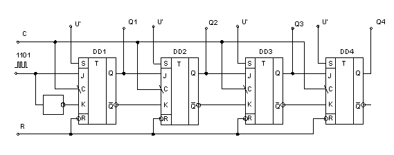 4-х разрядный сдвигающий регистр с последовательным вводом. Допустим, что в регистр последовательно вводится начиная с младшего разряда двоичный код 1101, который поступает с внешнего устройства синхронно с тактовыми импульсами. С первым тактовым импульсом в триггер DD1 записывается «1» младшего разряда. Со следующим тактовым импульсом эта «1» будет сдвинута в триггер DD2 и окажется на его выходе. Одновременно в 1-ый триггер запишется «0». После 4-х тактовых импульсов параллельный код на выходах Q1—Q4 будет соответствовать последовательному входному. После пятого тактового импульса сигнал, бывший на выходе Q4 выводится из регистра и пропадает. После 8 тактов регистр полностью очищен. Дополнительная логика позволяет вводить информацию параллельно и снимать последовательно. Сдвигающийся регистр может быть использован в качестве кольцевого счетчика или счетчика Джонса, который применяется для последовательного вывода информации без ее стирания.
