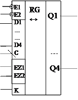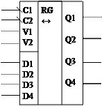 Ввод информации параллельным кодом осуществляется при V2=1 и C2=0. Сдвиг информации в триггерах происходит по перепаду 1-0 на С2. Входы V1 и C1 при этом блокированы. В этом же режиме по входам V2, С2 производится преобразование последовательного кода в параллельный со сдвигом влево. В этом случае поток информации происходит в обратном направлении. Для этого соединяют Q4 – D3, Q3 – D2, Q2 – D1. Информация подается на D4. Сдвиг влево по перепаду 1-0 на С2.