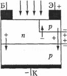 Фототранзистор — это полупроводниковый прибор, реагирующий на облучение световым потоком и способный одновременно усиливать фототок. Фототранзистор имеет, как и обычный биполярный транзистор, два рn-перехода. В электрическую цепь фототранзистор включается по схеме с общим эмиттером. Рассмотрим как один из возможных вариантов включения фототранзистор с разомкнутой базой (рис. 8). При таком включении напряжение UКЭ, несмотря на то что база оборвана, распределяется между обоими переходами пропорционально их сопротивлению. Причем напряжение UКЭ подается как прямое (+) на эмиттер, обратное (-) на коллектор. Потенциальный барьер на эмиттерном рn-переходе скомпенсирован только частично, так как большая часть напряжения U приложена к коллектору.