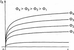 В отсутствие освещения в замкнутой цепи протекает темновой ток. При освещении базы начинается процесс генерации носителей заряда (дырки направляются к коллектору, а электроны — к эмиттеру). Происходит компенсация потенциального барьера эмиттерного перехода из-за того, что электроны накапливаются на границе с эмиттером. Это вызывает дополнительную инжекцию основных носителей — дырок из эмиттера в базу, где они становятся неосновными и под действием обратного напряжения 11обр на коллекторном переходе переходят в коллектор. Таким образом, в фототранзисторе управление производится за счет светового потока. В фототранзисторе фототок усиливается, как и в обычном биполярном транзисторе, включенном по схеме с общим эмиттером, в Ь21 раз. Статические выходные характеристики фототранзистора 1К = f(UКз) при Ф = соnst аналогичны характеристикам биполярного транзистора, включенного по схеме с общим эмиттером (рис.9).