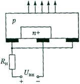 В светодиодах излучающей является только одна область, поэтому стремятся получить максимальную инжекцию в эту область. Если излучающей является р-область, то концентрация примеси в я-области должна быть гораздо выше, чем в излучающей области, в данном случае р-области. В р-области происходит рекомбинация носителей с выделением в окружающее пространство видимого света (электромагнитного излучения)., На рис. 10. показана конструкция плоскостного светодиода. При приложении прямого напряжения II к рп-переходу происходит диффузионный перенос носителей через него. Увеличивается инжекция дырок в п-область и электронов в р-область. Прохождение тока через рп-переход в прямом на правлении сопровождается рекомбинацией инжектированных неосновных носителей заряда. Рекомбинация происходит как в самом рn-переходе.. В большинстве полупроводников рекомбинация осуществляется через примесные центры (ловушки), энергетические уровни которых располагаются вблизи середины запрещенной зоны, и сопровождается выделением тепловой энергии — фонола. Такая рекомбинация называется безызлучательной. В ряде случаев процесс рекомбинации сопровождается выделением кванта света — фотона. Это происходит в полупроводниках с большой шириной запрещенной зоны — прямозонных полупроводниках. Электроны с более высоких энергетических уровней зоны проводимости переходят на более низкие энергетические уровни валентной зоны {переход зона-зона), при рекомбинации происходит выделение фотонов и возникает некогерентное оптическое излучение..