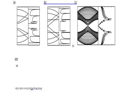 Figure 3. Energy band structure E (k) and density of states D (E) of armchair ribbons of various widths ((a) N = 4, (b) 5 and (c) 30).