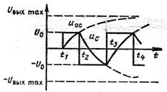 Для изменения скважности импульсов применяют цепочку из диода и резистора, включённых последовательно, в цепи ООС. В этом случае заряд и разряд конденсатора происходят через сопротивления различной величины, тем самым меняется соотношение между длительностью импульса и длительностью паузы. Процесс формирования выходного сигнала можно проследить по осциллограммам на рис.10.3, из которых видно, что заряд и разряд конденсатора С 1 происходит в моменты времени, когда выходное напряжение достигает значений U +(1 – βп) или U -(1 – βп), где U +, U - – напряжение насыщения ОУ для положительной и отрицательной полуволны; βп = R 4 / (R 4 + R 3) – коэффициент передачи цепи ПОС.