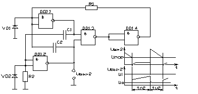 Рис.10.5. Мультивибратор на логических элементах и его временные диаграммы
