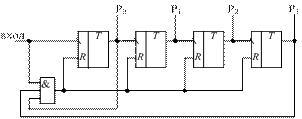 Рис. 16.6. Схема реверсивного двоичного счетчика Так как сигнал разрешения на элементе «И» должен присутствовать в момент, когда триггер, его создающий переключается в состояние «0», то в данном счетчике нужно применять двухтактные триггеры, где процессы приема и передачи информации на выход разделены во времени. Счетчик с произвольным Ксч (с принудительным обнулением) Логический элемент «И» подготавливается к выдаче сигнала сброса на девятом счетном импульсе, так как его входы контролируют состояния выходов Р0 и Р3. При появлении единиц на этих выходах элемент «И» пропускает входной сигнал (10-й импульс) на входы сброса всех разрядов. Ксч = 10.