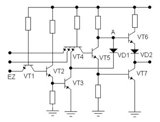 Логические элементы с тремя выходными состояниями (Z-состояние). Когда VT3 заперт, схема действует подобно обычному логическому элементу 2И-НЕ, т.к. VD1 смещен в обратном направлении. Если VT3 открыт, VD1 также открыт. U в точке А близко к нулю и VT6 заперт. VT5 также заперт, т.к. на эмиттере VT4, который связан с коллектором VT3, логический ноль. Следовательно, VT7 также заперт, и выходной вывод окажется отсоединенным от входных цепей и обеих шин питания. При этом уменьшается также потребляемая микросхемой мощность.