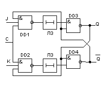 JK-триггеры не имеют неопределенных состояний. При всех входных комбинациях, кроме J = K = 1, они действуют подобно RS-триггеру. Причем J играет роль S, а К=R. При J=K=1 в каждом такте происходит опрокидывание триггера и выходные сигналы меняют свое значение. JK-триггеры относятся к универсальным устройствам (регистры, счетчики, делители), но кроме того, путем определенных соединений выводов, легко преобразуются в триггеры других типов. По схеме JK-триггеры отличаются от RS-триггеров наличием обратной связи с выхода на вход, поэтому состояние JK-триггера зависит не только от сигналов на входах J и K, но и от логической связи с ними сигнала с выходов Q и Q¯. Элементы временной задержки играют роль стабилизированного состояния триггера и на его функциональные свойства не влияют. Назначение – создание временного сдвига между моментом ввода входной информации JnQn¯ или KnQn и начала выхода Qn+1 и Qn+1¯. Без этих цепей во время действия комбинации Jn = Kn = 1 началась бы генерация для предотвращения которой задержка должна быть превыше длительности тактирующих импульсов. Действие JK-триггера: Qn+1 = Jn Qn¯VKn¯Qn.