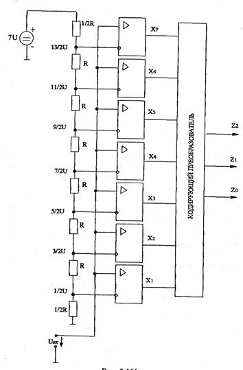 К основным характеристикам АЦП относят число разрядов, время преобразования, нелинейность и др. Число разрядов — количество разрядов кода, связанного с аналоговой величиной, которое может вырабатывать АЦП. Часто говорят о разрешающей способности АЦП, которую определяют величиной, обратной максимальному числу кодовых комбинаций на выходе АЦП. Так, 10-разрядный АЦП имеет разрешающую способность (210 = 1024)-1, т. е. при шкале АЦП, соответствующей 10 В, абсолютное значение шага квантования не превышает 10 мВ. Время преобразования - интервал времени от момента заданного изменения сигнала на входе АЦП до появления на его выходе соответствующего устойчивого кода. Характерными методами преобразования являются следующие: параллельного преобразования аналоговой величины и последовательного преобразования. Рассмотрим АЦП с параллельным преобразованием входного аналогового сигнала. По параллельному методу входное напряжение одновременно сравнивают с п опорными напряжениями и определяют, между какими двумя опорными напряжениями оно лежит. При этом результат получают быстро, но схема оказывается достаточно сложной.