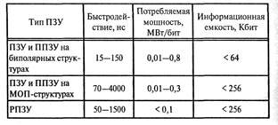 В РПЗУ запоминающие ячейки строятся на основе МОП-технологий. Используются различные физические явления хранения заряда на границе между двумя различными диэлектрическими средами или проводящей и диэлектрической средой. В первом случае диэлектрик под затвором МОП-транзистора делают из двух слоев: нитрида кремния и двуокиси кремния (SiN4 — SiO2). Было обнаружено, что в сложной структуре SiN4 — SiO2 при изменении электрического напряжения возникает гистерезис заряда на границе раздела двух слоев, что и позволяет создавать запоминающие ячейки. Такие транзисторы называют МНОП-транзисторами в соответствии с их структурой: металл-нитрид кремния-окисел-полупроводник. Запись информации в ячейки на МНОП-транзисторах осуществляется подачей относительно высоких напряжений (около 20 В), а перед записью осуществляется электрическое стирание старой информации (запись 0 во все запоминающие элементы). Таким образом, ЗУ на МНОП-транзисторах — это РПЗУ ЭС или EPROM. Они позволяют осуществлять 104 — 106 перезаписей, энергонезависимы и могут хранить информацию годами. В обозначении микросхем с электрическим стиранием после номера серии указывают две буквы PP. Так, микросхема К1601РР1 выполнена на основе p-МНОП-транзисторов, по входу и выходу совместима с ТТЛ-структурами, имеет выходы с тремя состояниями и организацию IK x 4. Время хранения информации 500 часов. Во втором случае основой запоминающей ячейки является лавинно-инжекционный МОП-транзистор с плавающим затвором (ЛИЗМОП-транзисторы).