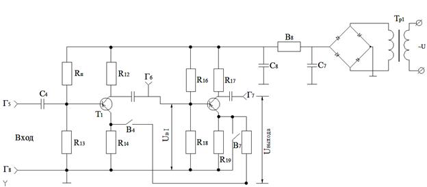 Измерить напряжения на гнездах Г6 и Г7 с помощью вольтметра ЛВ2. Изменяя амплитуду входного сигнала в пределах 1-10 мВ измерить напряжения на выходах первого и второго каскадов.