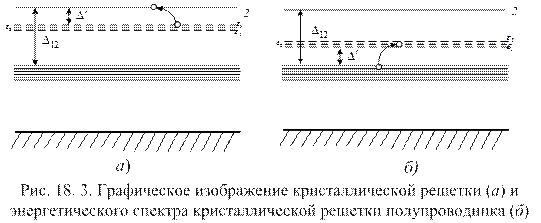 В состав всех тел входят одинаковые по своим свойствам элементарные заряженные частицы – носители зарядов. Но различные тела обладают разными электрическими свойствами. Различие свойств обусловлено разным характером движения носителей зарядов в разных телах. В одних телах заряженные частицы под действием внешнего электрического поля могут свободно перемещаться от атома к атому. Такие тела называют проводниками. В других, под действием внешнего поля, происходит лишь небольшое смещение частиц. Эти тела называют диэлектриками. Долгое время характер движения носителей зарядов объясняли различной степенью связи атомов в проводниках и диэлектриках. В действительности разделение тел на проводники и диэлектрики определяется различной структурой их энергетического спектра, т. е. объясняется законами квантовой механики. В квантовой механике движение носителей зарядов объясняется принципом Паули. Согласно этому принципу, изолированный атом вещества обладает набором энергетических состояний (уровней). Набор энергетических уровней атома получил название энергетического спектра. Пример графического изображения спектра приведен на рис. 18.1, а. Разрешенный i-й уровень энергии атома обозначают символом εi. Графически ему соответствует горизонтальная линия. Энергия электронов атома может принимать только те уровни, которые находятся в его наборе. Кроме того, электроны обладают собственным моментом количества движения (спином). Проекция спина на какую-либо ось может иметь только два значения. Это означает, что в каждом энергетическом состоянии может находиться только один электрон с определенной ориентацией спина. Другими словами, любое энергетическое состояние атома может быть свободным или занятым, но если оно занято, то только одним электроном и не более. При объединении атомов в кристалл образуются «кристаллические решетки». Ядра атомов занимают места в узлах решетки. Электронные оболочки атомов в большей или меньшей степени перекрываются. Теперь они принадлежат не отдельному атому, а всей решетке. Общим становится и энергетический спектр. Из каждого энергетического уровня εi возникает полоса уровней. Такую полосу называют разрешенной зоной. Расстояние между разрешенными зонами называют запрещенной зоной. Число электронов в разрешенной зоне равно числу однородных атомов в кристалле. Однако и в разрешенной зоне каждый электрон c определенной ориентацией спина занимает свой, отличный от других электронов, уровень. Энергетический спектр кристаллической решетки принимает вид, приведенный на рис. 18.1, б.