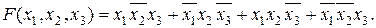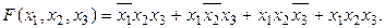 4. БУЛЕВЫ ФУНКЦИИ (ФУНКЦИИ ЛОГИКИ) Результат выполнения логических операций над двоичными переменными называется булевой функцией F. Она может принимать только два значения – " 0 " или " 1 ". Задать булеву функцию – значит указать ее значение при всех возможных комбинациях переменных (аргументов). Если число переменных равно " n ", то число возможных комбинаций равно Булевы функции необходимы для синтеза цифровых устройств, содержащих только логические элементы. Для представления булевых функций часто применяют словесное описание, табличное и алгебраическое представление. Словесное описание функции должно однозначно определять все случаи, в которых выходные сигналы принимают значение " 1 " или " 0 ". Например: Спроектировать устройство с тремя входами x 1, x 2, x 3, на выходе которого сигнал F = 1 в случае, если на любые два или на все три входа подан сигнал " 1 ". Табличное представление – это перечисление всех возможных комбинаций входных сигналов. Для устройства, заданного приведенным выше словесным описанием, таблица значений имеет вид: Таблица 29.1.