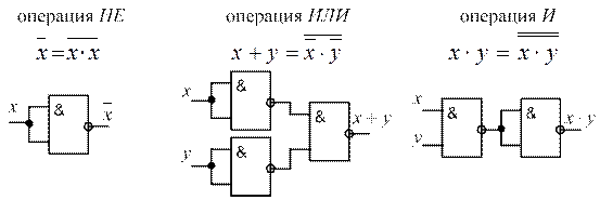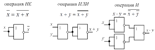 На основании полученных формул (29.4) или (29.5) можно построить логическую схему, состоящую из элементов " ИЛИ ", " И ", " НЕ ". Для функции (29.4) схема приведена на рис. 29.3, а. При построении схемы сначала изображаются инверторы, затем ячейки " И " и потом ячейки " ИЛИ ". Схемы рис. 29.2, в и рис. 29.3 содержат все типы логических элементов. При проектировании всегда стремятся сократить перечень используемых элементов. В связи с этим созданы логические элементы, способные выполнить простейшую функцию двух аргументов " ИЛИ-НЕ ", а также " И-НЕ ". С помощью каждого из этих элементов можно выразить все основные операции булевой алгебры, а значит, реализовать любую логическую функцию. Покажем это. Для элемента " ИЛИ-НЕ "