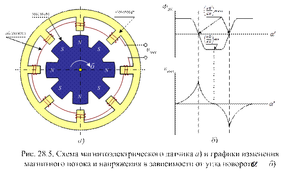 Таким образом, контактно – транзисторная система позволяет существенно увеличить срок службы контактов прерывателя, но не исключает их механического износа. Возможная вибрация контактов ограничивает число оборотов ДВС сверху. На следующем этапе развития электронных систем зажигания контакты прерывателя заменены бесконтактным датчиком. Датчик вырабатывает импульсы в строго заданные моменты времени. Эти импульсы усиливаются по мощности и управляют электронным ключом. Таким образом, в схему электронной системы зажигания включается дополнительный каскад – усилитель сигналов датчика или формирующий каскад. Совокупность формирующего каскада и электронного ключа стали называть коммутатором, а систему зажигания – бесконтактной (БСЗ). В БСЗ рассмотренной структуры угол включенного состояния электронного ключа αвкл постоянный. Это значит, что время накопления энергии tн зависит от частоты вращения коленчатого вала n по закону tн = αвкл / 6n. С уменьшением частоты вращения n время накопления, а, следовательно, и ток разрыва, и мощность, рассеиваемая элементами схемы, увеличиваются. Разработка электронного устройства (регулятора), нормирующего время накопления энергии, стала следующим этапом развития БСЗ. Решение этой задачи позволило снизить мощность потерь в катушке и коммутаторе на низких и средних частотах вращения вала двигателя, увеличить ток разрыва и энергию искрового разряда. Основными недостатками БСЗ с электронным регулятором времени накопления являются несовершенство механических автоматов угла опережения зажигания и механический способ распределения энергии по цилиндрам двигателя, порождающие погрешности момента образования искры. Системы с электронным регулированием угла опережения зажигания наиболее совершенны по исполняемым функциям. Дальнейшее развитие электронных систем зажигания идет в направлении использования современной элементной базы и достижений электроники. Успехи цифровой электроники позволили создать цифровые и микропроцессорные системы зажигания. В рамках данной лекции кратко рассмотрим принципы реализации отдельных функциональных узлов электронных систем зажигания. 3.2. Датчики углового положения коленчатого вала ДВС В настоящее время наиболее широкое применение получили магнитоэлектрические датчики и датчики на эффекте Холла. Схема магнитоэлектрического датчика с переменным магнитным потоком приведена на рис. 28. 5, а. Схема включает статор с неподвижной катушкой и постоянный магнит, жестко связанный с валом распределителя зажигания. Число пар полюсов постоянного магнита равно числу цилиндров двигателя. При вращении постоянного магнита в обмотке статора возникает переменное напряжение uвых(t), причем,