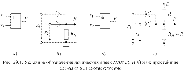 Правила выполнения операции И заключаются в следующем: 0 · 0 = 0; 1 · 0 = 0; (29.2) 0 · 1 = 0; 1 · 1 = 1. Логические схемы, реализующие правила (29.2), называются ячейками И. Их схемное обозначение приведено на рис. 29.1, в. Простейшая реализация логической ячейки И на диодах приведена на рис. 29.1, г.
