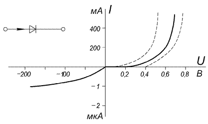 Выпрямителем называется устройство, преобразующее переменное напряжение в постоянное (выпрямленное). Среднее значение (постоянная составляющая) этого постоянного напряжения используется потребителем. Наличие переменных составляющих (пульсаций) в результате преобразования неизбежно. Различными мерами пульсации могут быть уменьшены до сколь угодно малых значений. Одним из способов уменьшения пульсаций является применение фильтров. Рассматриваемые в работе схемы служат основой построения большинства источников питания, используемых в самых различных областях техники. Они обеспечивают постоянным напряжением питание электромашинных механизмов, технологических процессов, электронные устройства. Знание свойств источников питания необходимо специалисту для грамотной их эксплуатации. Основным элементом схем выпрямления является диод. Диодом называется нелинейный элемент, обладающий весьма малым сопротивлением протеканию тока в прямом направлении по сравнению с обратным. В настоящее время наибольшее распространение получили полупроводниковые диоды. Их свойства определяются р-п- переходом, образованным между двумя кристаллами полупроводникового материала с различными типами проводимостей. Вольтамперная характеристика (ВАХ) полупроводникового диода, например 2Д504А, изображена на рис. 1.1. Основными параметрами диодов являются максимальное допустимое значение тока в прямом направлении IПРmax и максимальное допустимое значение обратного напряжения UОБРдоп. При протекании через диод тока в прямом направлении равного номинальному, падение напряжения не превышает одного вольта. Приложенное к диоду обратное напряжение вызовет обратный ток величиной от нескольких микроампер до нескольких миллиампер.