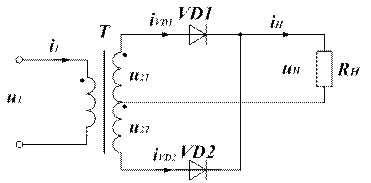 При выборе диода для схемы однополупериодного однофазного выпрямления необходимо, чтобы максимально допустимое обратное напряжение диода было больше амплитудного значения напряжения на вторичной обмотке трансформатора (Uобр max ≥ U2m) (рис. 1.3). К недостатку однополупериодного выпрямителя относится присутствие постоянной составляющей тока во входной цепи. Если выпрямитель питается через трансформатор (рис. 1.2), то постоянная составляющая тока вызывает подмагничивание сердечника трансформатора, что приводит к необходимости увеличивать его габаритные размеры. Так же к недостаткам однополупериодной схемы выпрямления следует отнести значительные пульсации выпрямленных тока и напряжения. Выпрямители подобного типа применяют, главным образом, в специальных маломощных установках. Схема двухполупериодного выпрямителя со средней точкой показана на рис. 1.4.