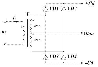 Рассматриваемая схема относится к двухполупериодной схеме выпрямления. Коэффициент пульсации на выходе выпрямителя Амплитуда обратного напряжения UОБРmax при одинаковом выпрямленном напряжении Ud в выпрямителе по мостовой схеме выпрямления (рис. 1.6) в два раза меньше, чем в выпрямителе по двухполупериодной схеме выпрямления со средней точкой (рис. 1.4). Такая схема выпрямления позволяет получить заданное выпрямленное напряжение при числе витков вторичной обмотки трансформатора, вдвое меньшем, чем в двухполупериодной схеме выпрямления со средней точкой (рис. 1.4) при прочих равных условиях. Данное обстоятельство приводит к снижению массогабаритной мощности трансформатора. Диаграммы токов и напряжений данного выпрямительного устройства представлены на рис. 1.7. Разновидностью мостовой схемы выпрямителя является мостовая схема со средней общей точкой, как в схеме выпрямителя (рис. 1.4). При наличии вывода от середины вторичной обмотки трансформатора выпрямитель имеет два выходных напряжения. Первый выход это напряжение между положительной клеммой выпрямителя и средней точкой, второй выход – между отрицательной клеммой и средней точкой. При соединении средней точки обмотки с общим проводом получается два источника симметричных разнополярных напряжений. Такие источники постоянных напряжений при наличии сглаживающих фильтров применяются для питания аналоговых операционных усилителей (рис. 1.8).