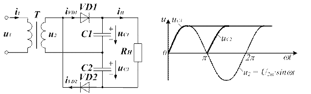 Схема выпрямления с умножением напряжения позволяет получить высокие значения выпрямленного напряжения без использования высоковольтных трансформаторов. Наибольшее распространение на практике получили однофазные схемы выпрямления с удвоением напряжения (рис. 1.9). Принцип действия такой схемы заключается в зарядке каждого из последовательно соединенных конденсаторов через свою группу диодов от выходной обмотки трансформатора. Выходное напряжение выпрямителя при этом равно сумме напряжений на всех конденсаторах и может в несколько раз превышать амплитуду напряжения выходной обмотки трансформатора uВЫХ = uН = uC1 + uC2 » 2u2m.