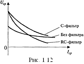 Внешняя характеристика выпрямителя отражает динамику изменения выходного напряжения выпрямителя в зависимости от изменения тока нагрузки. При увеличении выходного тока выходное напряжение уменьшается из-за увеличения падения напряжения на обмотках трансформатора, диодах, подводящих проводах, элементах фильтра (рис. 1.12). Наклон внешней характеристики при том или ином токе Iср характеризуется выходным сопротивлением RВЫХ, которое определяется выражением