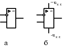 Теоретическая часть Операционным усилителем (ОУ) называют усилитель электрических сигналов, предназначенный для выполнения различных операций над аналоговыми и импульсными величинами при работе с отрицательными обратными связями. В настоящее время промышленность выпускает операционные усилители второго и третьего поколений, построенные по двухкаскадной схеме. Эти ОУ по своим основным параметрам значительно превосходят операционные усилители первого поколения, создаваемые по трехкаскадной схеме. Основу всех ОУ составляют дифференциальные каскады. Первый каскад обеспечивает коэффициент усиления, достигающий нескольких сотен тысяч. Входной каскад, в котором часто используются полевые транзисторы, обеспечивает входные характеристики ОУ, в частности его высокое входное сопротивление. Выходным каскадом является бестрансформаторный двухтактный усилитель мощности (эмиттерный повторитель, работающий в режиме усиления В или АВ). Он служит для согласования высокого выходного сопротивления первого дифференциального каскада ОУ с низкоомным нагрузочным устройством. Поэтому ОУ имеет низкое выходное сопротивление. Кроме того, в состав современных ОУ входят цепи защиты по входу от перенапряжений и по выходу от превышения выходного тока, а также цепи компенсации влияния температуры. В настоящее время операционные усилители, изготовляемые по интегральной технологии, являются самыми универсальными и массовыми аналоговыми устройствами. ОУ широко применяются не только в усилителях, но также в различных генераторах, преобразователях, стабилизаторах напряжения, компараторах, источниках эталонных напряжений, активных фильтрах, электронных ключах и т. д. Широкие функциональные возможности при небольшом числе стандартных типов ОУ, выпускаемых промышленностью, достигаются за счет включения разнообразных внешних цепей обратных связей. Наибольшее распространение получили интегральные полупроводниковые ОУ, обладающие наименьшими габаритами и массой, способные работать в диапазоне температур от - 60 до +125°С. Они имеют коэффициент усиления 106 и более при усилении сигналов частотой от нуля до единиц мегагерц. На работу подобных ОУ весьма слабо влияют такие дестабилизирующие факторы, как изменения температуры и питающего напряжения. Современные ОУ относительно дешевы и доступны для широкого применения, что обеспечивается их массовым автоматизированным изготовлением. Надежность операционного усилителя, включающего в себя несколько сотен элементов и более, соответствует надежности отдельного транзистора, что обеспечивается интегральной технологией, при которой все элементы (транзисторы, диоды, резисторы и др.) и соединения между ними выполняются в едином технологическом цикле. Как показывает практика, срок службы хорошего полупроводникового интегрального ОУ может превысить 20 лет. На рис. 4.1, а приведено условное обозначение операционного усилителя. Как видно, ОУ имеет два входа и один выход. Вход, напряжение на котором сдвинуто по фазе на 180° относительно выходного напряжения, называют инвертирующим и обозначают кружком. Второй вход является неинвертирующим, так как напряжение на нем и выходное напряжение совпадают по фазе. Выводы, к которым подключаются источники питающего напряжения + UИП и – UИП, а также вспомог