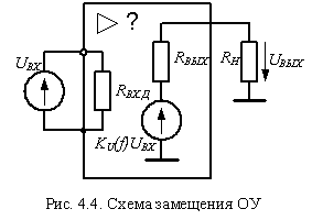 1) частоту срезa fСРЕЗ, значению которой соответствует снижение модуля коэффициента усиления ОУ в 2) частоту единичного усиления f1, при которой модуль, коэффициента усиления ОУ уменьшается до единицы (для современных ОУ f1 = 15 – 20 МГц); 3) максимальную скорость нарастания выходного напряжения VUвых определяющую наибольшую скорость изменения выходного напряжения ОУ при воздействии прямоугольного входного импульса; скорость нарастания определяется как отношение ∆UВЫХ к ∆t (для современных ОУ VUвых = 0,1–100 В/мкс); 4) время установления tУСТ, определяющее изменение выходного напряжения ОУ от уровня 0,1 до уровня 0,9 от установившегося выходного напряжения при воздействии на вход прямоугольного импульса (для ОУ широкого применения tУСТ = 0,05 – 2 мкс). Одним из важных достоинств ОУ является подавление синфазных помех. Поэтому ОУ характеризуется коэффициентом ослабления синфазных сигналов КОС.СФ=20×lg (КСФ /КU) (для ОУ общего назначения КОС.СФ = 70 –120 дБ). Выпускаемые в настоящее время интегральные ОУ классифицируют по следующим группам: - ОУ общего назначения, составляющие наиболее многочисленную группу универсальных ОУ; - прецизионные ОУ, позволяющие поддерживать с высокой точностью большой коэффициент усиления КU; они имеют высокое входное сопротивление и малое напряжение смещения (UСМ ≤ 0,5 мВ); типичным прецизионным ОУ является интегральная микросхема 153УД5; - быстродействующие ОУ, характеризующиеся повышенной скоростью нарастания выходного напряжения и малым временем установления; они имеют частоту единичного усиления 15 - 20 МГц (например, ОУ КР544УД2); - микромощные ОУ, потребляющие наименьшую энергию от источника питания (например, ОУ 140УД12, IПОТР < 0,18 мА при UИП = ±6 В). Наиболее широко используются ИМС серий 140 и 153. Операционные усилители рассчитаны на применение симметричных разнополярных источников питания напряжением от ±5 до ±27 В. В настоящее время чаще всего используют напряжения ±5 и ±15 В с допускаемым отклонением ±(5 –10)%. Применение подобных источников питания упрощает задачу компенсации смещения нуля ОУ и предотвращает появление ненужной постоянной составляющей тока в нагрузочном устройстве. Для анализа работы ОУ часто пользуются схемой замещения, изображенной на рис. 4.4. Входная часть схемы замещения определяется входным дифференциальным сопротивлением RВХ.Д, a выходная часть содержит источник ЭДС KU (f)· UВХ и резистивный элемент с сопротивлением RВЫХ.