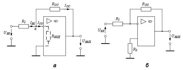 Рис. 4.5. Схема инвертирующего усилителя (а) и инвертирующего усилителя с «выравнивающим» резистором (б) Входное напряжение UВХ подается на инвертирующий вход через резистор R1. С помощью резистора RОС осуществляется отрицательная параллельная обратная связь по напряжению. Неинвертирующий вход усилителя при этом заземлен. В соответствии с первым законом Кирхгофа для узла а уравнение для токов записывается в виде: IВХ =IОС+IОУ. Анализ рассматриваемой схемы включения ОУ значительно упрощается при допущении, что ОУ идеален. Тогда при любом значении Rн≠0 и конечном значении выходного напряжения (оно не может быть больше напряжения питания ОУ) входное напряжение будет равно нулю. В этом случае инвертирующий и неинвертирующий входы при UВХ=0 как бы замкнуты накоротко. Это так называемое виртуальное замыкание. В отличие от обычного короткого замыкания при виртуальном замыкании ток между входами ОУ отсутствует, т.е. IОУ = 0 и IВХ = IОС. Тогда UВХ= R1∙IВХ и Uвых= RОС∙IОС. Коэффициент усиления инвертирующего усилителя