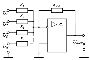 При КU → ∞ выходное сопротивление стремится к нулю. Учитывая, что у неинвертирующего усилителя сопротивление RВХ.Д . очень большое, a RВЫХ.ОС мало, такой усилитель применяют часто как согласующий элемент при работе с высокоомным источником сигнала и низкоомным нагрузочным устройством. Обычно для усилителей большое входное сопротивление не нужно, так как при этом они оказались бы весьма чувствительными к изменениям входного тока флуктуационного происхождения. Поэтому во входную цепь усилителя включают резистор сопротивлением R2<<RВХ.Д, который и должен определять входное сопротивление неинвертирующего усилителя. Значение сопротивления R2 выбирают в пределах 0,5 –1 МОм. Устранение Uсм в усилителях на ОУ производится чаще подключением потенциометра RБАЛ к специальным выводам ОУ. Как отмечалось, на основе двух ОУ - инвертирующего и неинвертирующего - при использовании различных цепей обратных связей строят разнообразные электронные устройства. На основе инвертирующего усилителя можно построить сумматор (рис. 4.7).