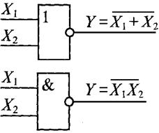 На практике часто используется расширенный набор логических элементов, позволяющих также составлять функционально полные системы. К ним относятся элементы: ИЛИ-НЕ (элемент Пирса), реализующий функцию И-НЕ (элемент Шеффера), реализующий функцию Их обозначения и таблицы истинности приведены на рис. 5.4 и в таблице 5.4.