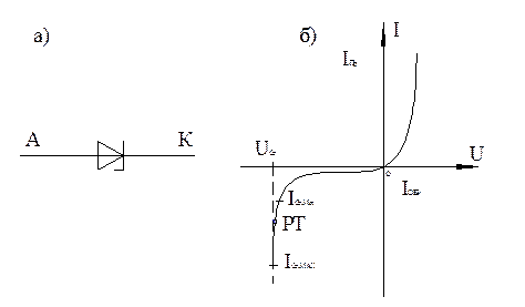 Рис.2.Полупроводниковый стабилитрон: а) условное графическое обозначение; б) вольт - амперная характеристика
