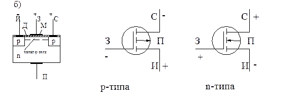 Рис.6. Полупроводниковая структура и условное графическое обозначение полевого транзистора с изолированным затвором: а) с встроенным каналом; б) с индуцированным каналом