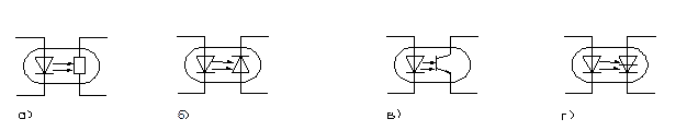 Рис.9.Условное графическое обозначение полупроводниковых оптронов: а) резисторного; б) диодного; в) транзиторного; г) тиристорного