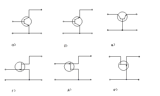Рис.16. Схемы включения транзисторов с общим(ей): а) эмиттером; б) коллектором; в) базой; г) истоком; д) стоком; е) затвором