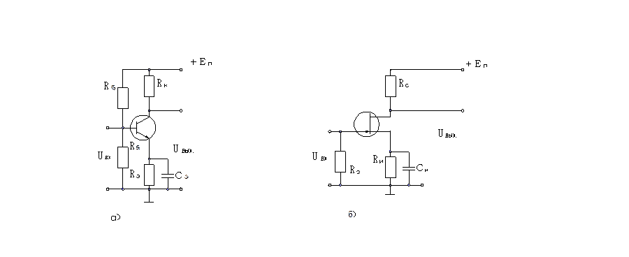 Рис.17.Схемы усилителей: а) на биполярном транзисторе; б) на полевом транзисторе