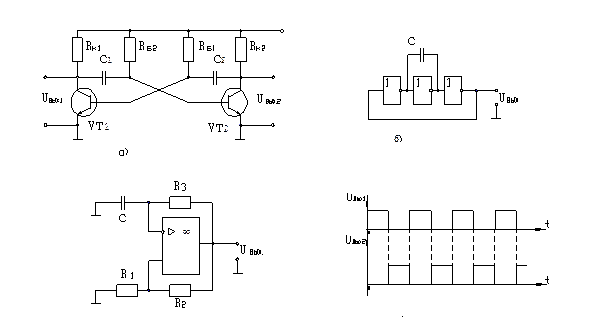 Рис.21. Схемы автоколебательных мультивибраторов: а) на дискретных элементах; б) на интегральных логических элементах; в) на операционном усилителе; г) их временные диаграммы